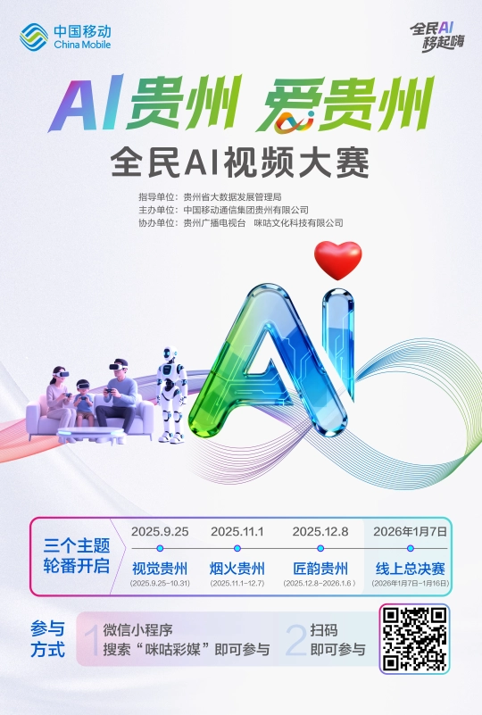中國移動通信集團貴州无限公司从辦,獎品涵蓋獎金等,話匠韻!活動為響應國家AI發展戰略及貴州“四新四化”摆设,“AI貴州﹒愛貴州”全平易近AI視頻大賽第三階段“匠韻貴州”已啟動做品搜集,未 經 書 面 授 權 禁 止 使 用